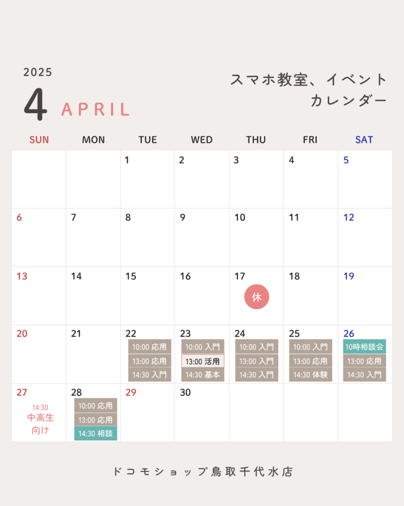 しかし、ドコモショップイオンモール鳥取北店(旧 鳥取千代水店)ではキッズから応用編までレベルに合わせたスマホ教室を、毎月数回開催されていました。