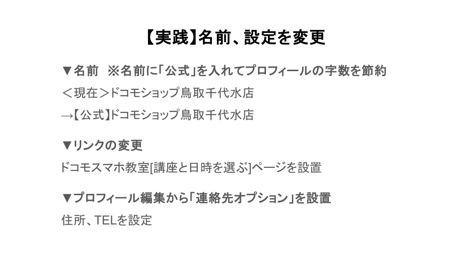 アカウント名に地域名をいれると「鳥取 ドコモ」などの検索で優先的に表示されるようになります。