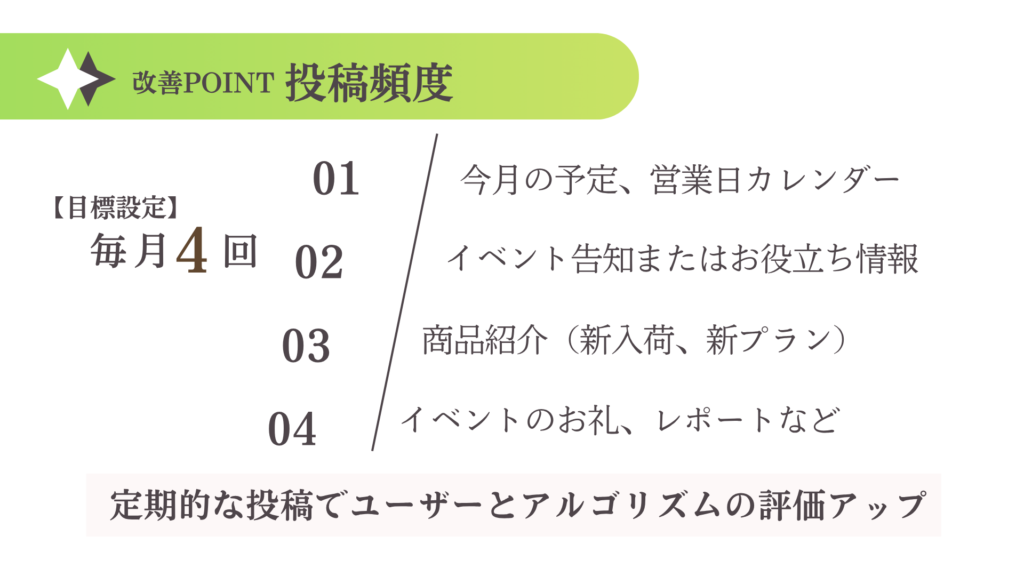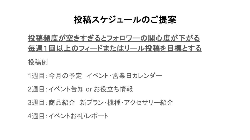 そのため、まずは週に1回、月4回の投稿プランをコンテンツ例とともにご提案しました。