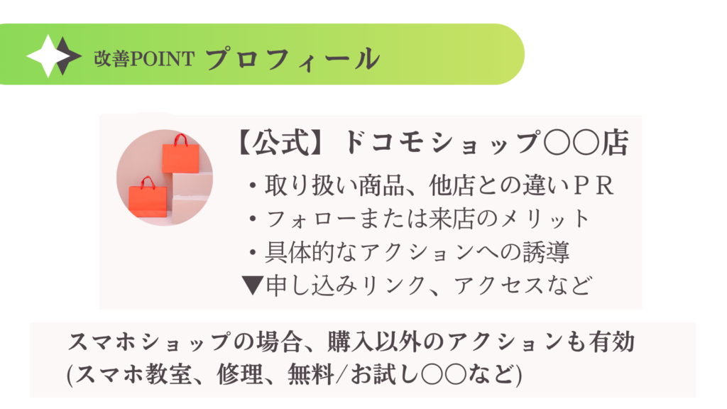 どんなサービスや取り扱い商品があるか、ユーザーにとってどんなメリットがある店舗(アカウント)なのかを具体的に記載し、さらに申し込みリンクなどへの誘導をわかりやすく記載することでユーザーへの訴求力をアップします。