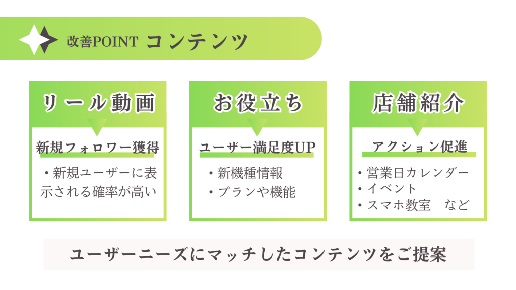 ユーザーが興味を持つコンテンツのバリエーションを増やすことでユーザーの満足度を高め、フォローや来店の下地作りを行います。