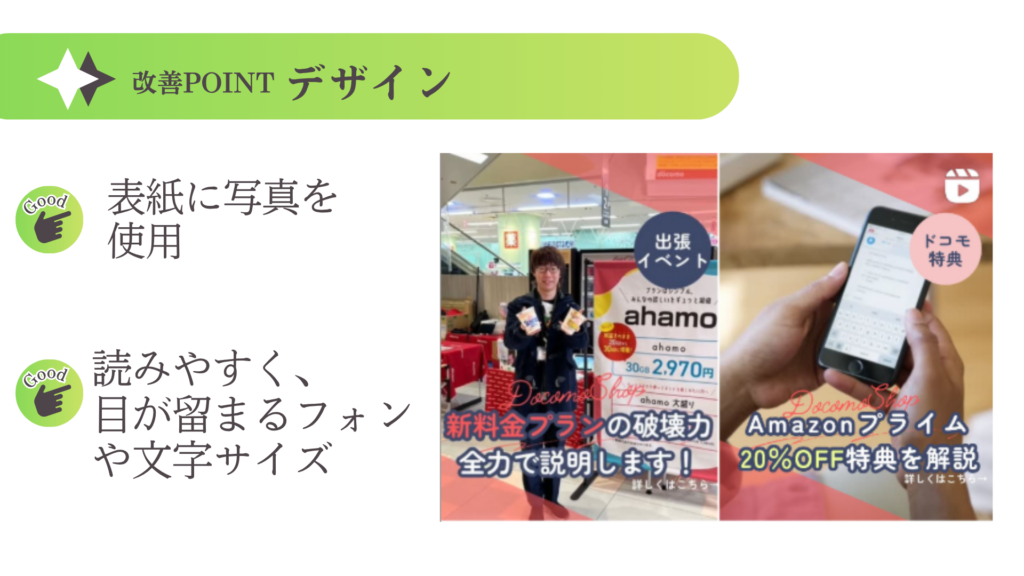 もともと記載いただいていた「お得情報」をより具体化して「スマホ効率化・節約プラン情報発信中」と記載し、他店との差別化を狙いました。