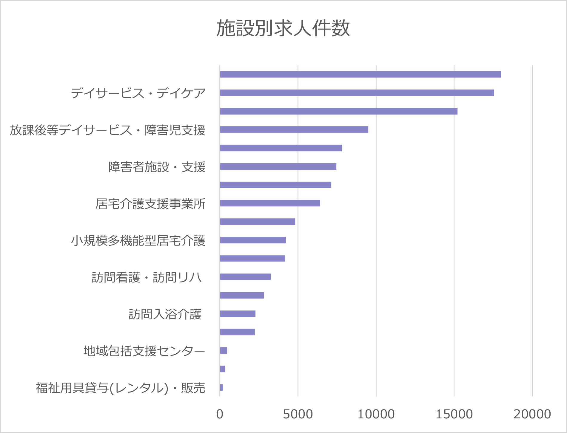 現場職と管理職の両方を紹介している点も特徴です。 介護福祉士、初任者研修、実務者研修(ホームヘルパー1級・2級)などの介護系職種の有資格者向けの求人から「未経験者歓迎」「無資格者相談OK」などの求人まで保有しており、幅広い人を対象としている点が特徴です。 求人を施設別に見ると「デイサービス・デイケア」、「放課後デイサービス・障害児支援」施設の求人は1万7,000件以上と最も多く保有しています。