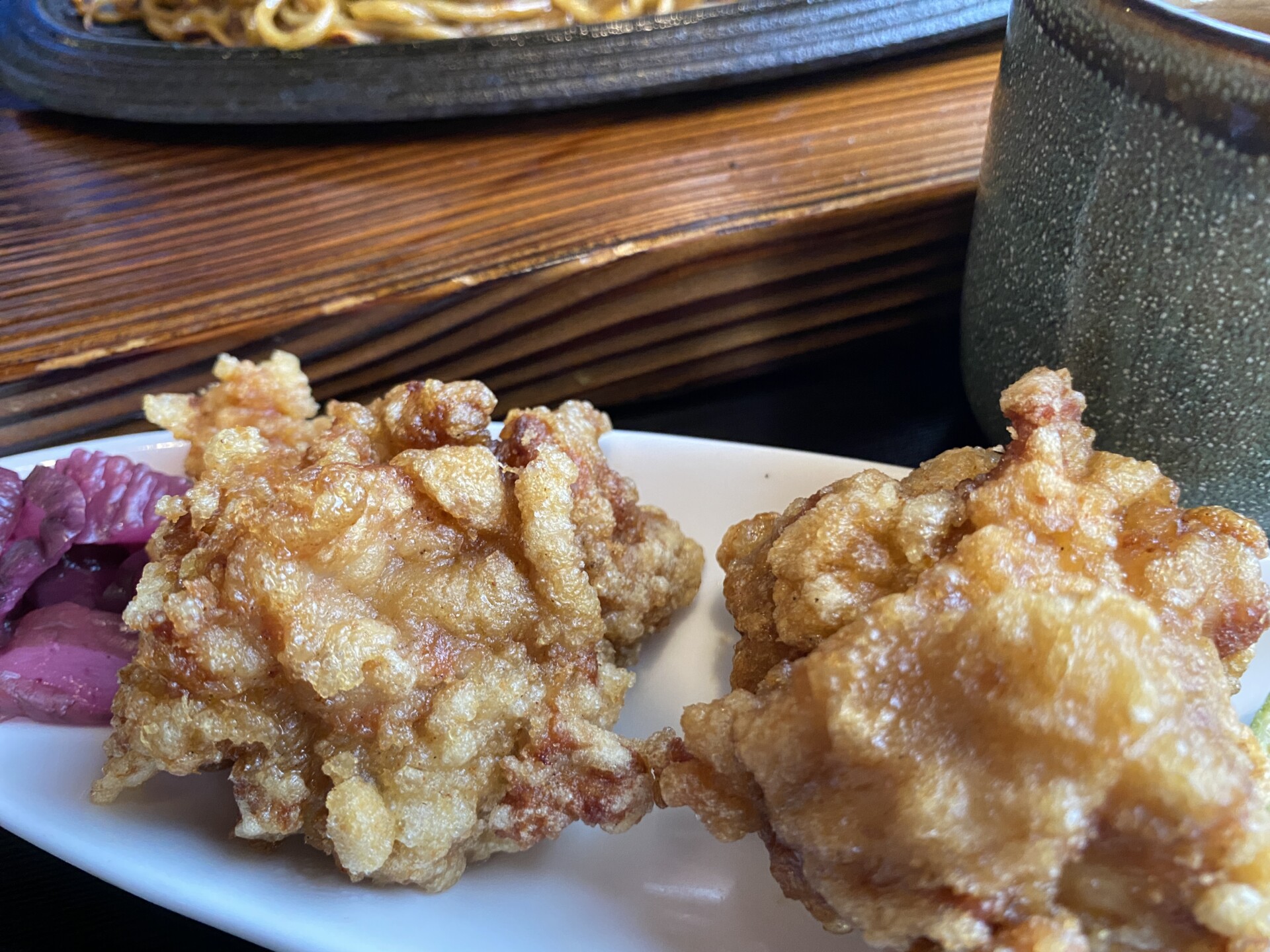 鉄板焼きそば770円+ご飯セット(ご飯・漬物・唐揚げ2個・味噌汁)440円を注文しました