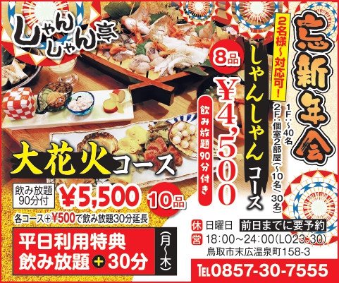 【飲み放題90分付き】忘新年会コース予約受付中! ![]() 2025年しゃんしゃん亭の『忘新年会コース』は鳥取の海鮮や飲み放題が付いたお得なプラン♪(料理は仕入れ等により変更となる場合があります) コースは2名様からご予約OK。10名、30名が座れる個室や最大40名が利用できるフロアもあります。 \しゃんしゃん亭のおいしいお酒と新鮮な地元料理を忘年会・新年会で♪/