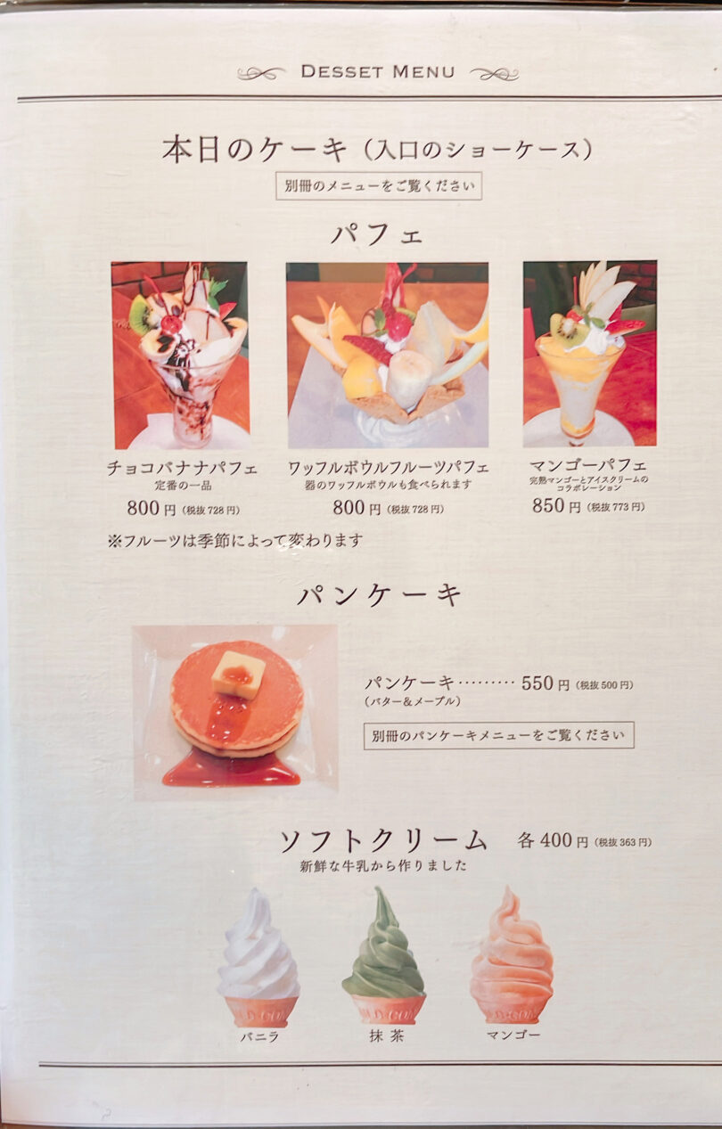 老舗カフェですが、ケーキにパフェ、豊富なドリンクメニューと色々楽しめるお店です。
