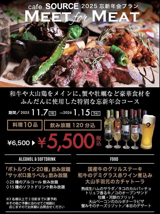 カフェソースでは豪華食材をたっぷり使った忘新年会コースを実施されています!