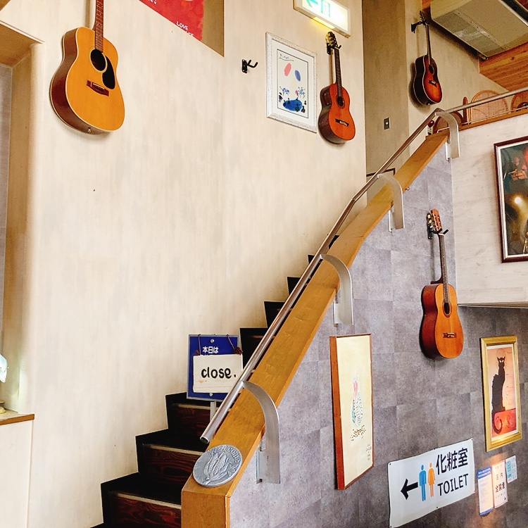 ギターや外国の雑貨、観葉植物など色々な色や素材のものが飾らていますが調和がとれた店内。