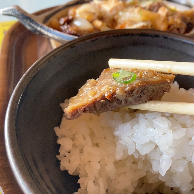 甘くて粘り気のある日南町産コシヒカリにピリッと濃い目に味付けされた牛すじ煮込みの相性は抜群。