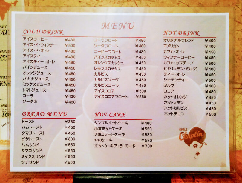 名前の最後に「ン」がつくと、「運がつく」「ラッキー」と言われていたことから、店名を「チャップリン」にしたそう。