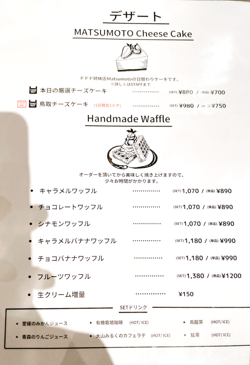 「チョコレートワッフル」のドリンクセットに、生クリームを増量して注文しました。