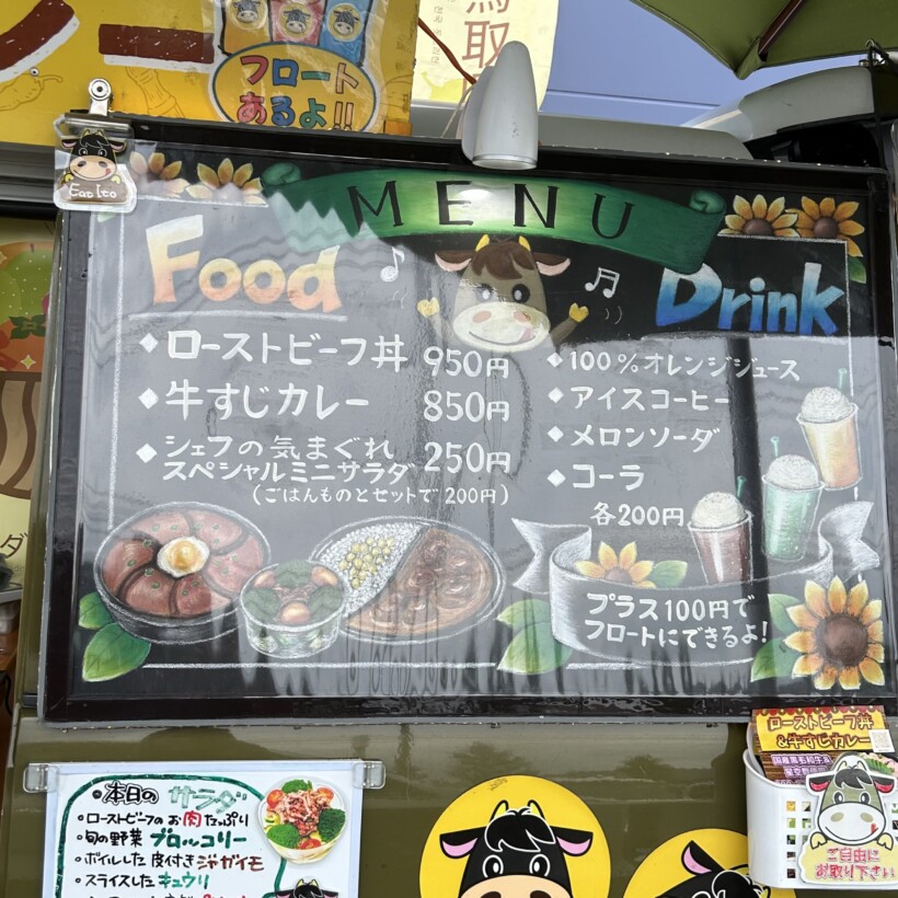 こちらのキッチンカーでは、「鳥取県産黒毛和牛」と「鳥取県産星空舞」を使用したローストビーフ丼と牛すじカレー、シェフのスペシャルサラダ、ドリンクが販売されています。