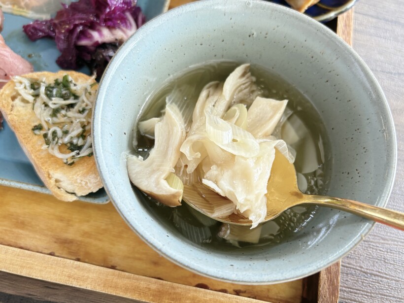 「腸活きのこのビネガースープ」は具沢山。ほんのりビネガーが香るマイルドな酸味で、あっさりとした味わいが楽しめます。