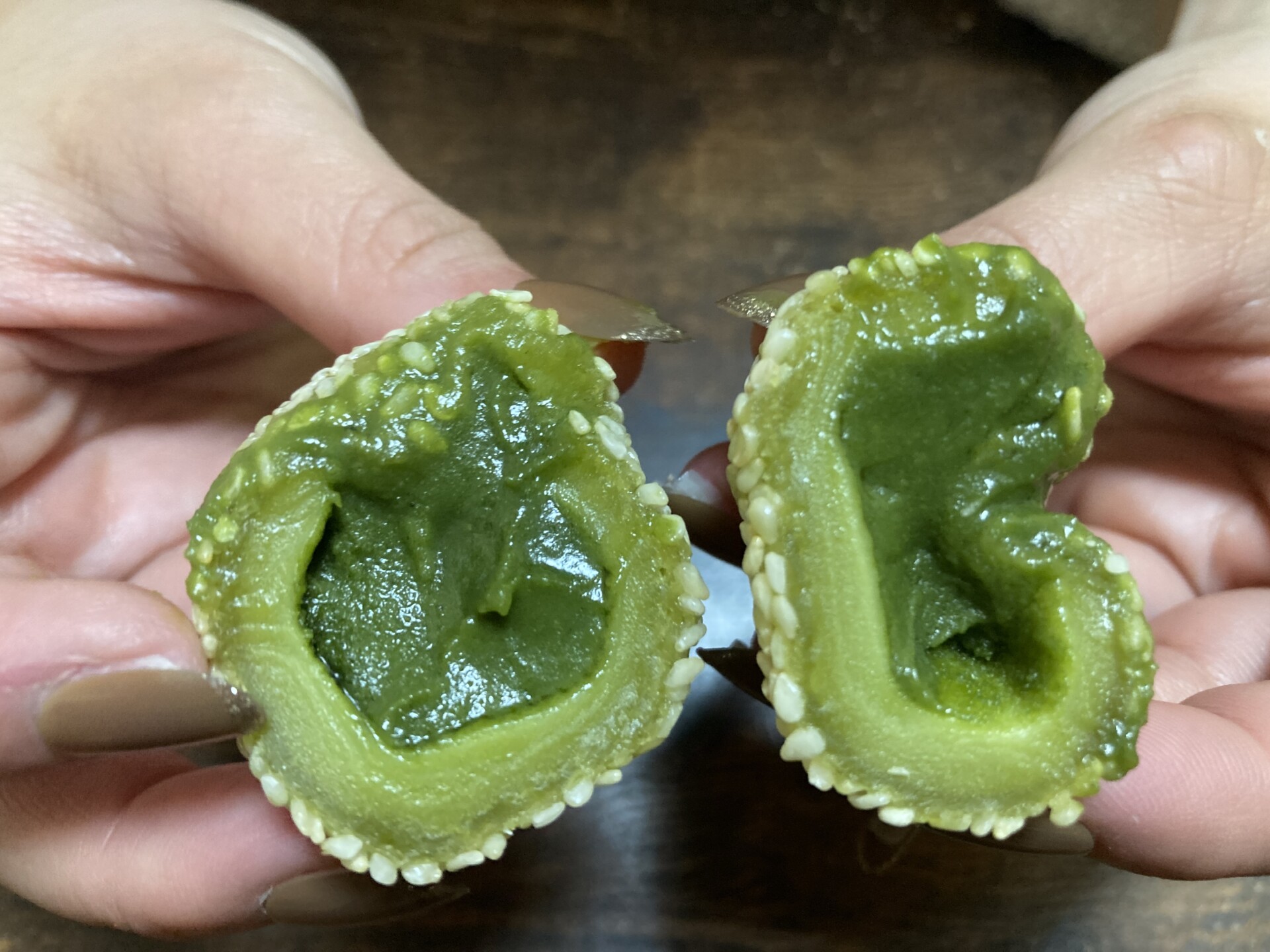 外はカリッと香ばしく、中はもちもち。中からは、コクがありつつもくどさのない、上品な甘さの黒ごま餡がとろり。