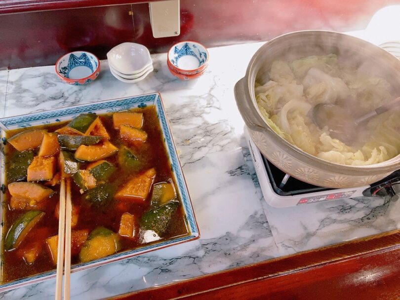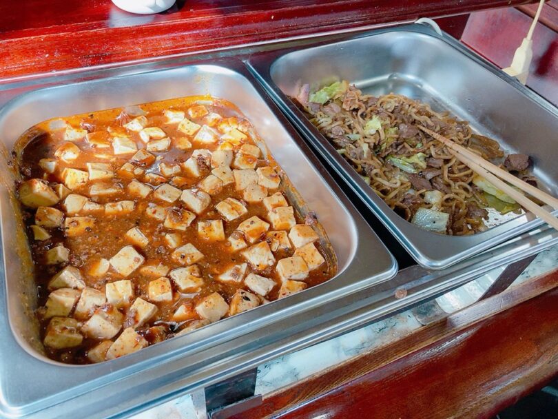 日替り、お時間によりますが焼きそば、麻婆豆腐や麻婆茄子、自家製豆腐、野菜の煮物やお漬物など常時10種類程度のおかず、オニオンスープなどが準備されています。