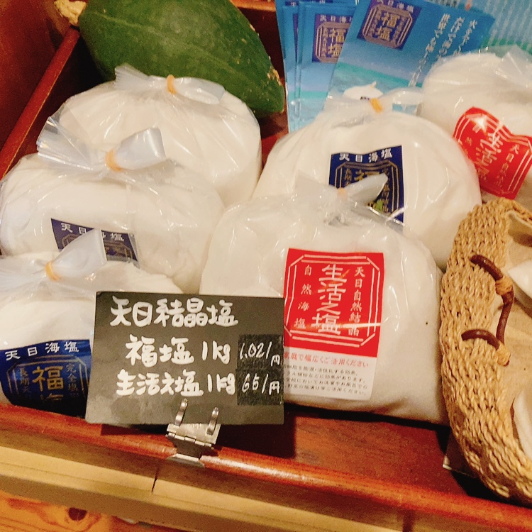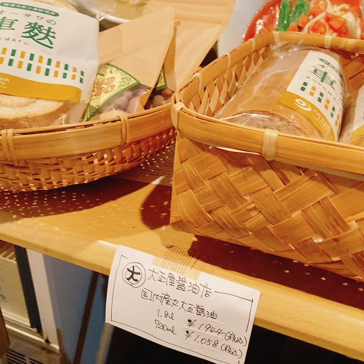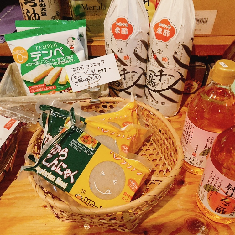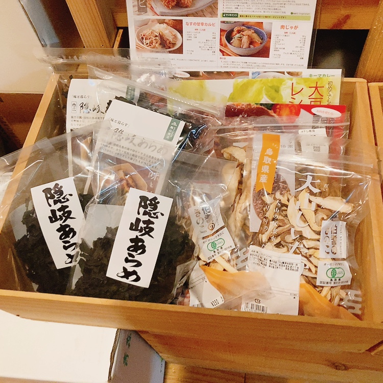 車麩、大豆醤油、乾燥しいたけ・あらめ、黒大豆・金時豆、てんぺ、米酢、あずき茶・有機ジュース、てんさい糖、天日結晶塩など山陰でできたこだわりの食材も多数販売されていました。