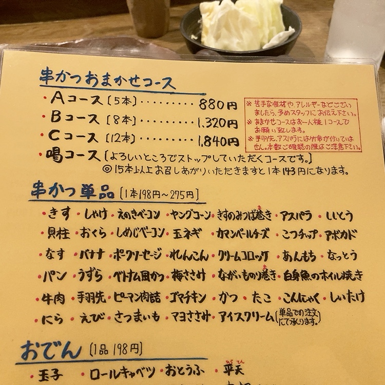 串かつは、自分で好きな串を頼むコースやお任せにするコース、単品注文など様々なコースがありました!