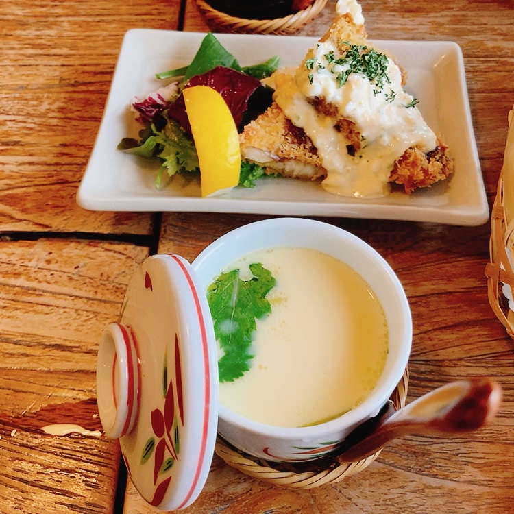 茶碗蒸しは京風。お上品でとろっとろの食感。大きなエビなど具材も入っていました。