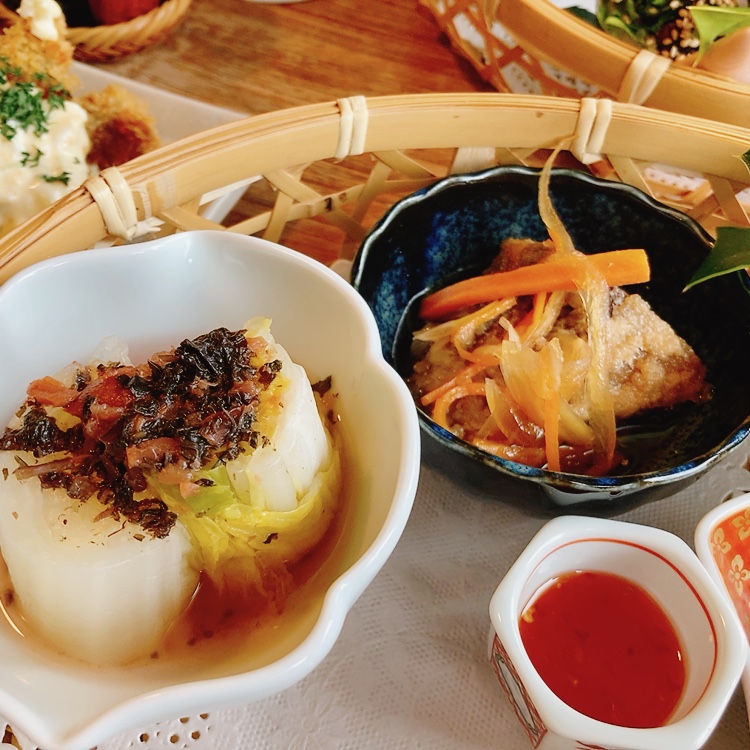 魚のフライに刺身、南蛮漬けで魚を堪能し、味噌汁や生春巻き、肉じゃがや白菜煮や茶碗蒸しで野菜やお肉を堪能できます。