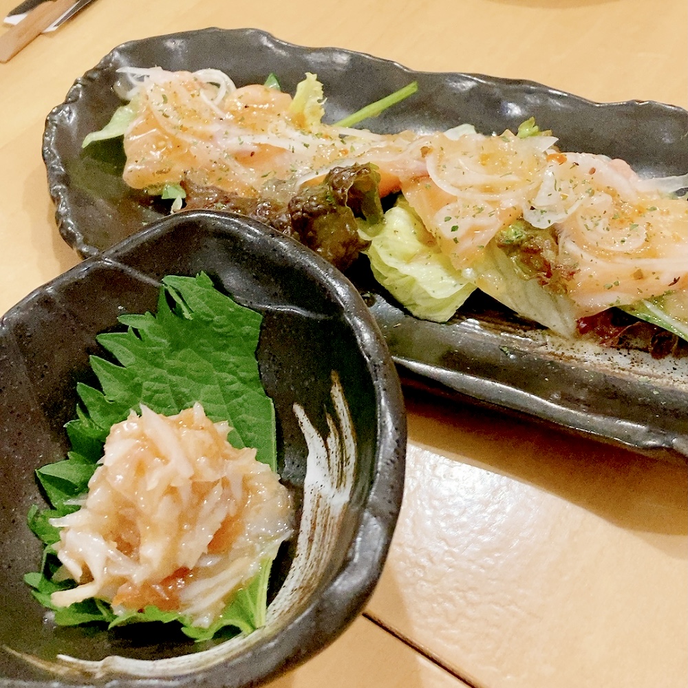 やげん軟骨の梅和え、サーモンカルパッチョなど