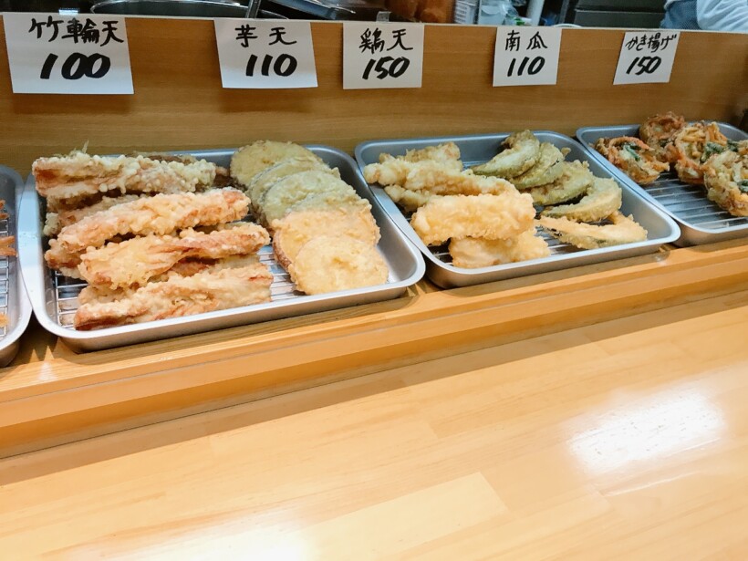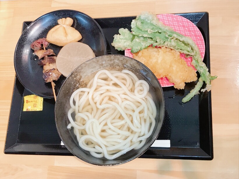 かけうどん温(中)+季節の天ぷら+おでんを注文しました