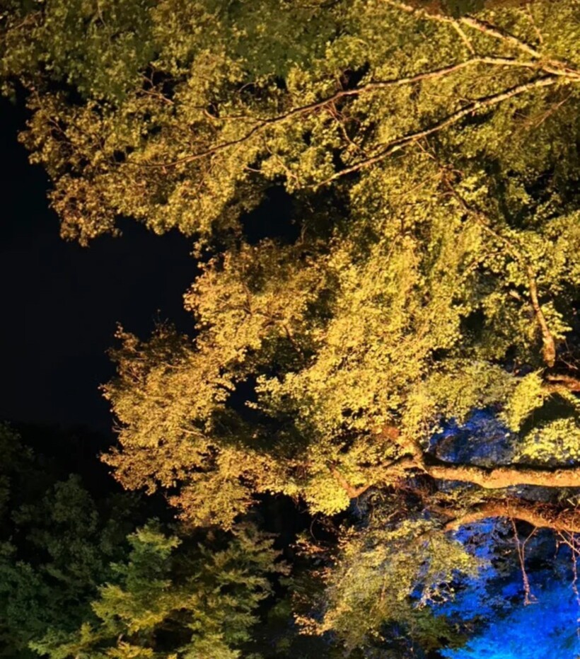 紅葉が様々なカラーにライトアップされ、門を抜けると光り輝くような幻想的な空間が広がっています。