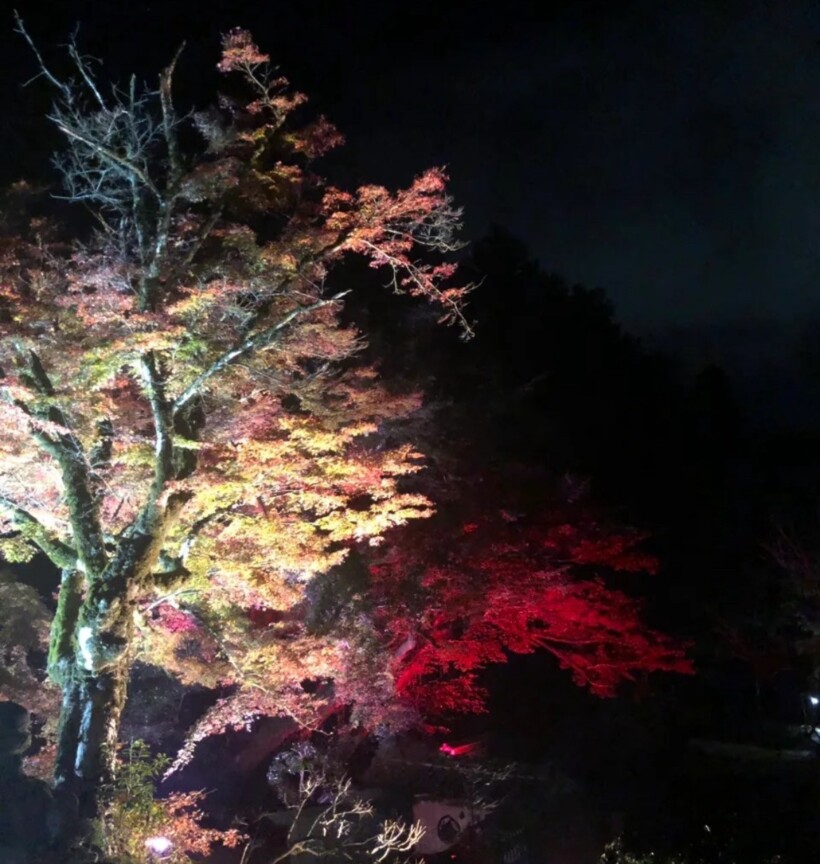 紅葉が様々なカラーにライトアップされ、門を抜けると光り輝くような幻想的な空間が広がっています。
