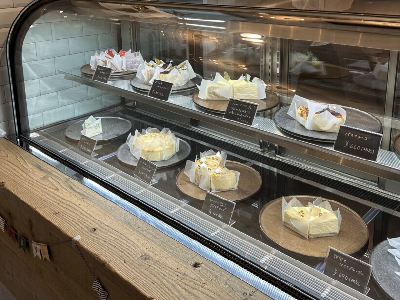 こちらはチーズケーキ専門店で、毎日約10種類の日替わりチーズケーキがショーケースに並びます。