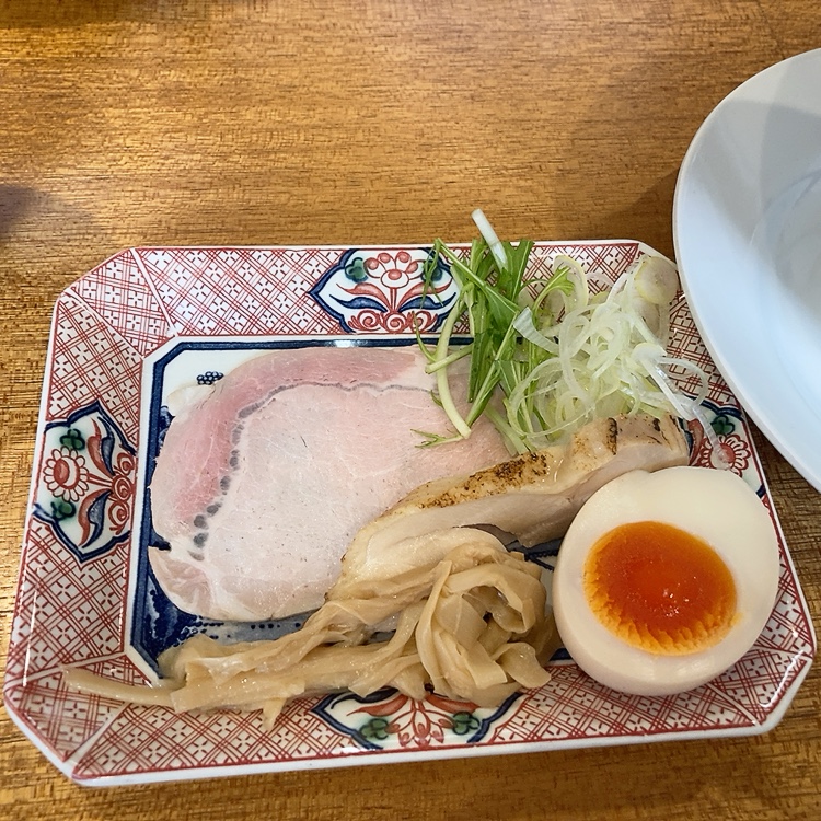 麺のみを楽しんだ後に、別皿の煮卵、豚ロース、豚バラの2種チャーシュー、薬味をトッピングしていきます。