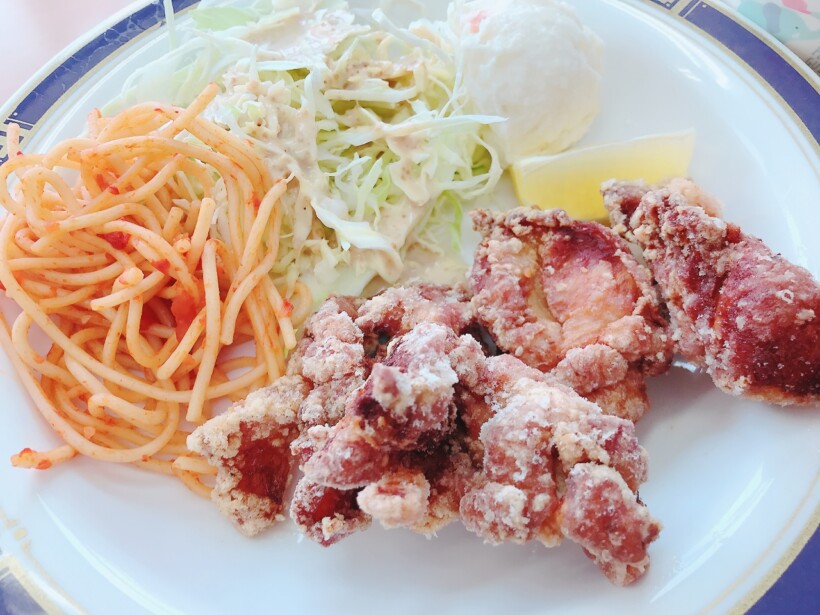 定食は、メインの唐揚げに加え、スパゲティ、キャベツの千切り、ポテトサラダがワンプレートに盛り付けられています。
