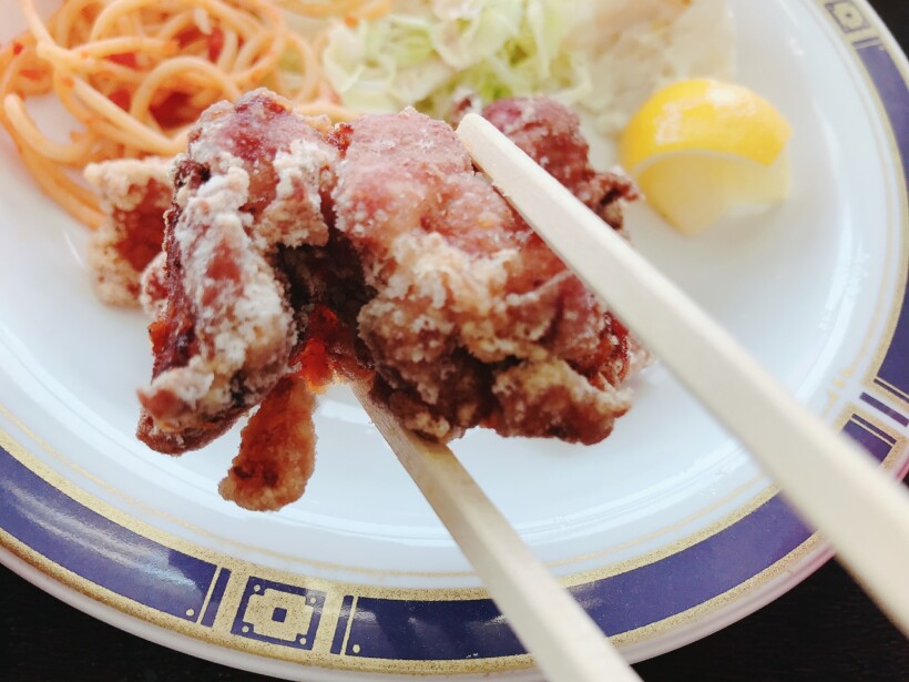 唐揚げは、衣はサクサク、中はジューシーで、あっという間に完食してしまいました。レモンを絞るとさわやかな酸味が加わり、箸が進みます。