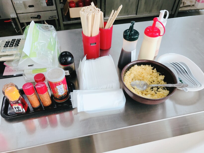 番号が呼ばれたら、料理を受け取ります。お手拭き、割り箸、レンゲ、天かす、ソースやマヨネーズなどの調味料は、受け取りカウンター横から自由に取ります。