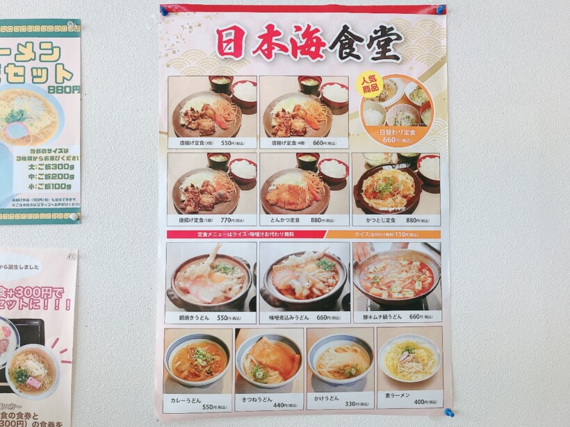 日本海食堂は、リーズナブルな価格で、定食やうどんをはじめ、さまざまなメニューが提供されています。