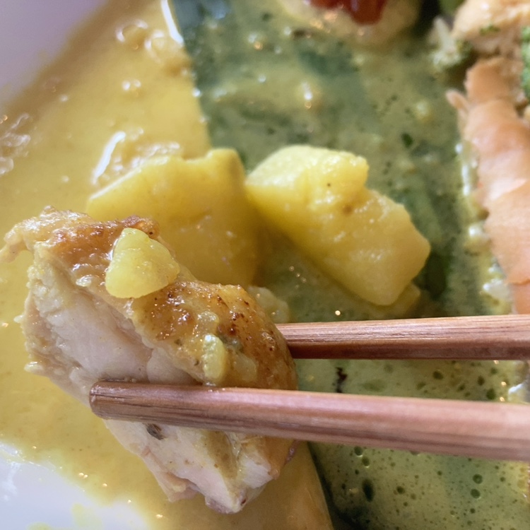 サーモンのソテーと、ジューシーなチキンにまろやかでスパイシーな「カレーソース」を合わせた一品。
