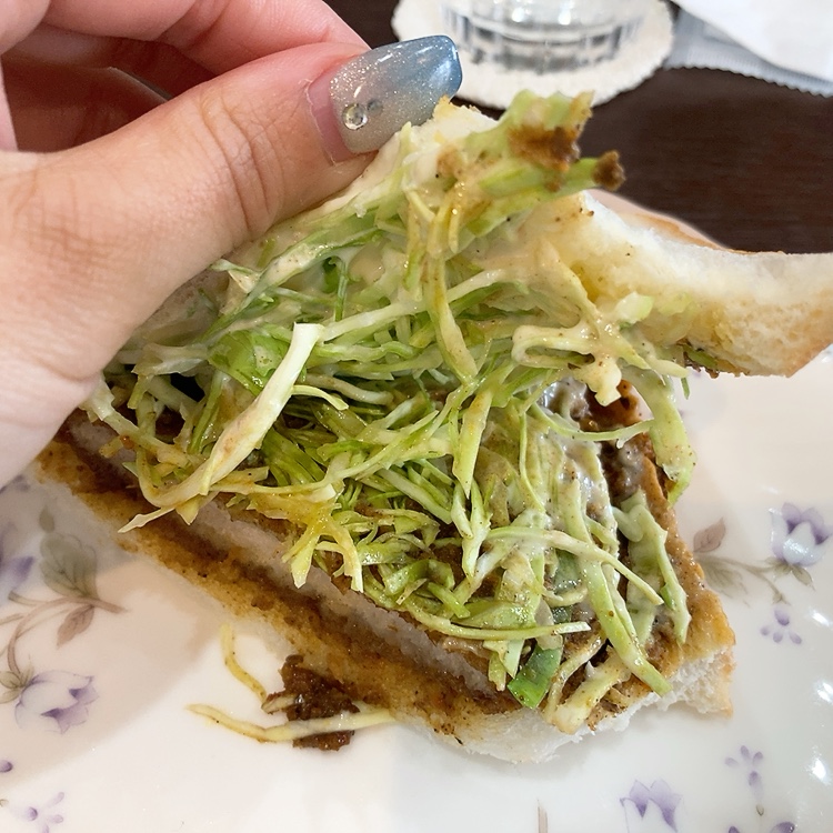 たっぷり挟まれたキャベツとマヨネーズが全体に馴染み、カレーの辛さをマイルドにしています。