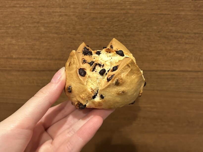 チョコチップメロンパンは、外はサクッと、中はふんわりで、チョコの甘さと生地の相性が抜群です。