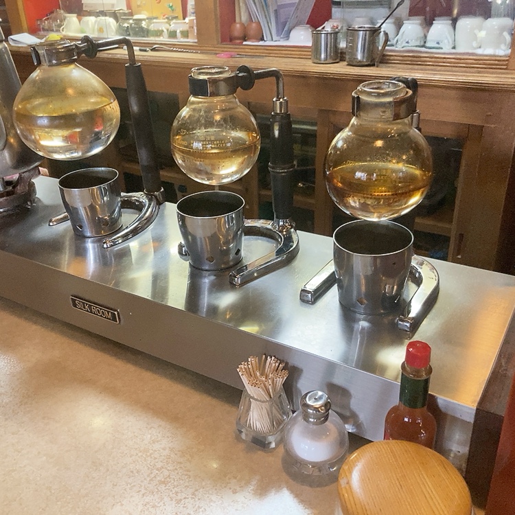カウンター席にはサイフォンが並び、懐かしさを感じさせます。