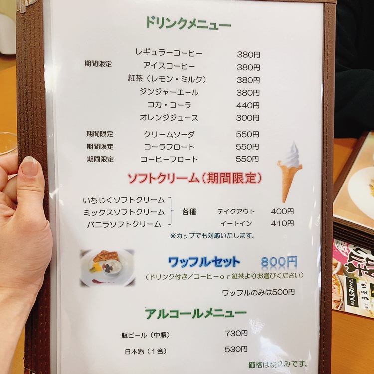お食事はもちろん、ソフトドリンクやワッフルなど、食後のデザートやほっと一息・喫茶メニューもあり。