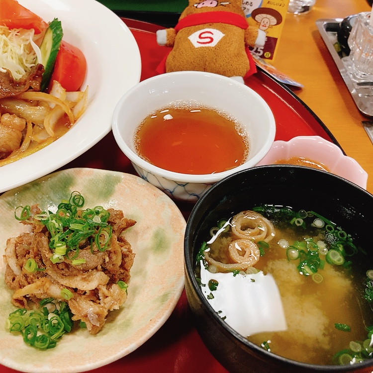 ご飯、小鉢二つ、汁物、メインの生姜焼きといった内容。