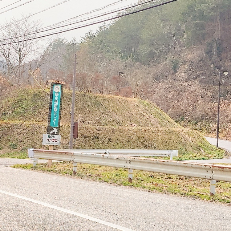 緑色の看板と緑水湖が目印