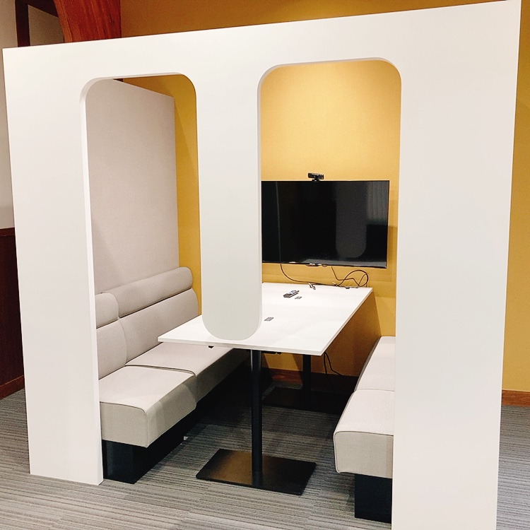 ロールスクリーンで仕切られた個人ブースやWi-Fiの完備されたコワーキングペースのある研修センターがあったり、