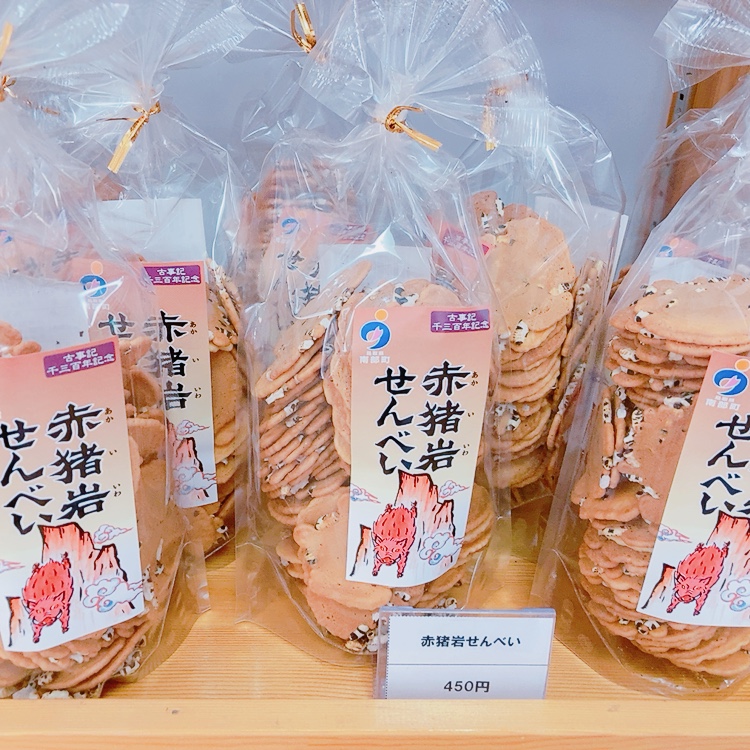 南部町産の古代米をポン菓子にしてせんべいに練りこんだ『赤猪岩せんべい』、