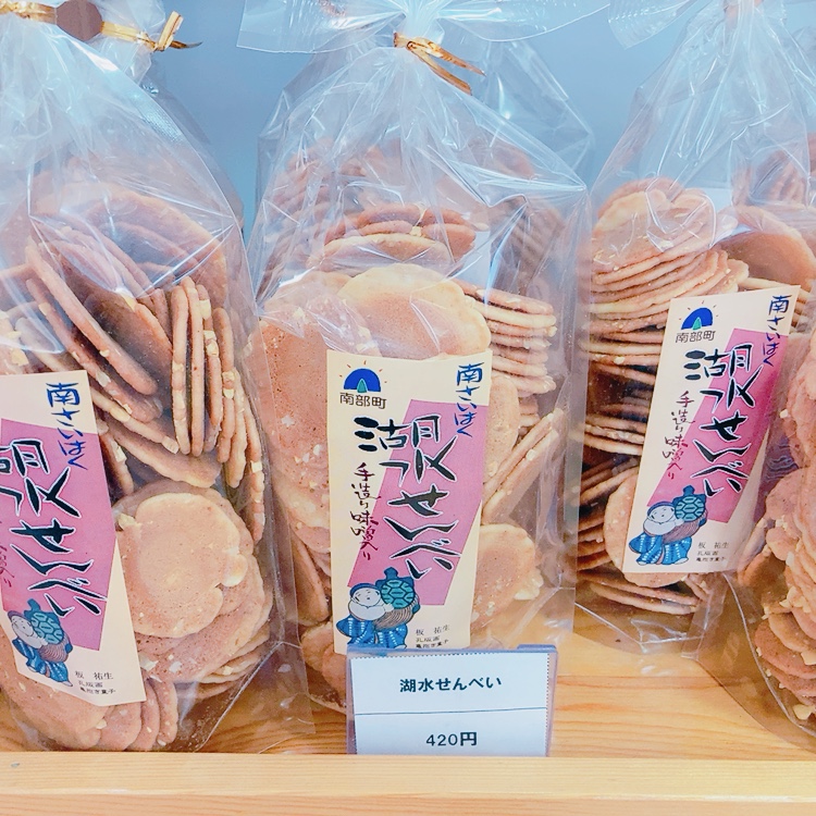 緑水湖にちなんで、お味噌がはいった甘じょっぱい『湖水せんべい』や