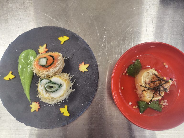 | ① 白ネギと長芋を焼く。焼き色を付ける。 ② 平目は打ち粉をして綿棒で叩き伸ばす。 ③ サーモンは包丁を入れて開く。 ④ ほうれん草をゆがき、氷水に落とす。水分を取る。 ⑤ ほうれん草と出汁でミキサーにかけ、ペーストにする。 ⑥ ペシャメルソースを作り、ほうれん草ペースト、ねり胡麻、醤油、砂糖で味付けをする。 ⑦ 平目、ほうれん草、焼きネギを並べて巻く。カダイフをつける。 ⑧ サーモン、ほうれん草、焼き長芋の順に並べてカダイフを付ける。 ⑨ 油で揚げ、適当な大きさで包丁で切る。 ⑩ 器に盛り付け、ソースを引く。前餅、紅葉であしらう。 |