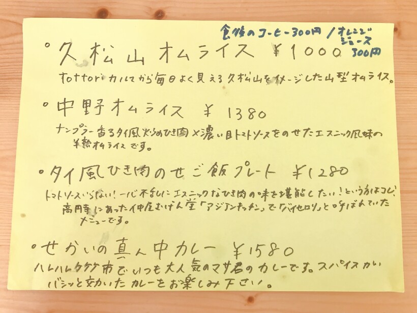 東京・中野で愛されてきた「中野オムライス」や自家製天然酵母パン「ココスキーパン」を引き継ぎながら、鳥取に創業してから増えた新メニュー「久松山オムライス」などもあります。