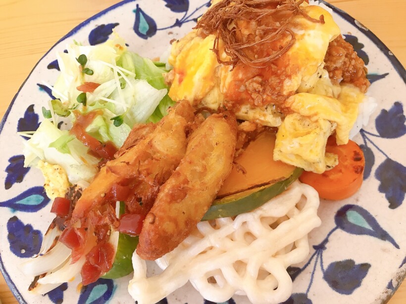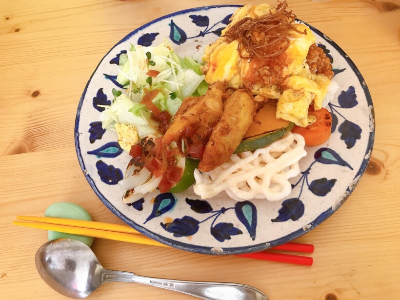 オムライス以外のおかずも盛りだくさんで、注文後に揚げてくださる香ばしいおかずたちやサラダでワンプレートはとても賑やかです。