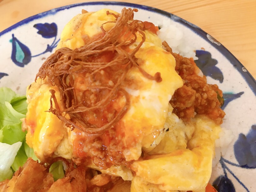 卵の上には、干したエノキを揚げたものがトッピングされています。市販のフライドオニオンは酸化してしまうので、それに代わるものとして丸さんが発案されました。