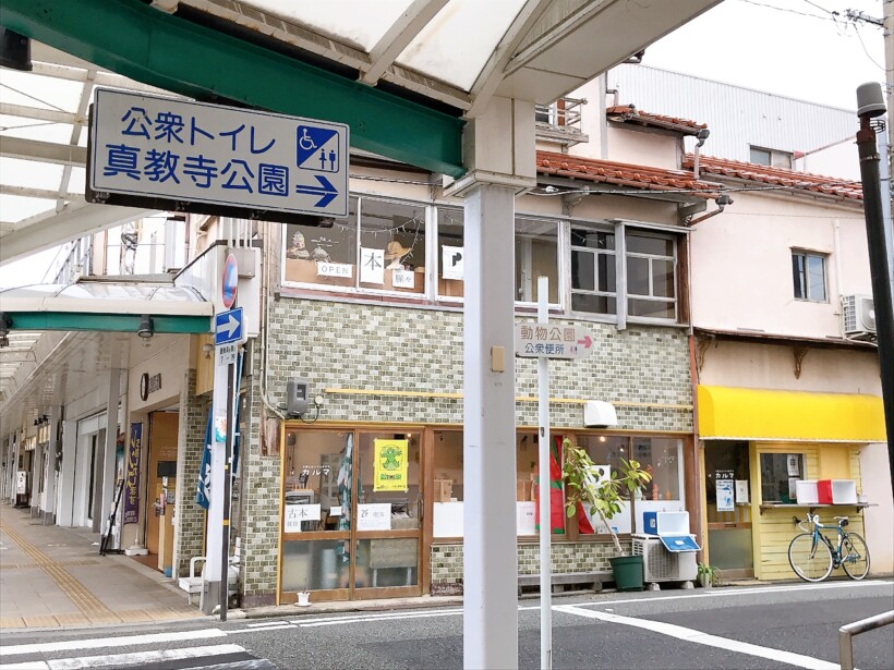 真教寺公園の看板が目印。タイル張りの外壁と大きなガラス窓のお店です。