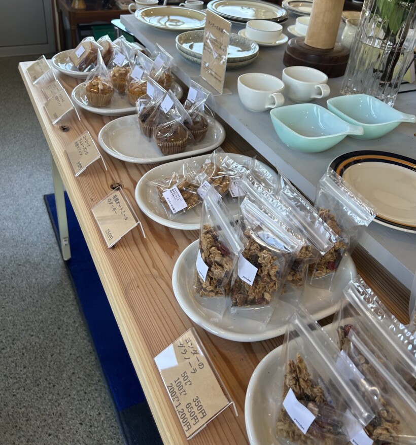 数多くの食器や壺などの古道具に加え、素材にこだわった焼き菓子も人気です。