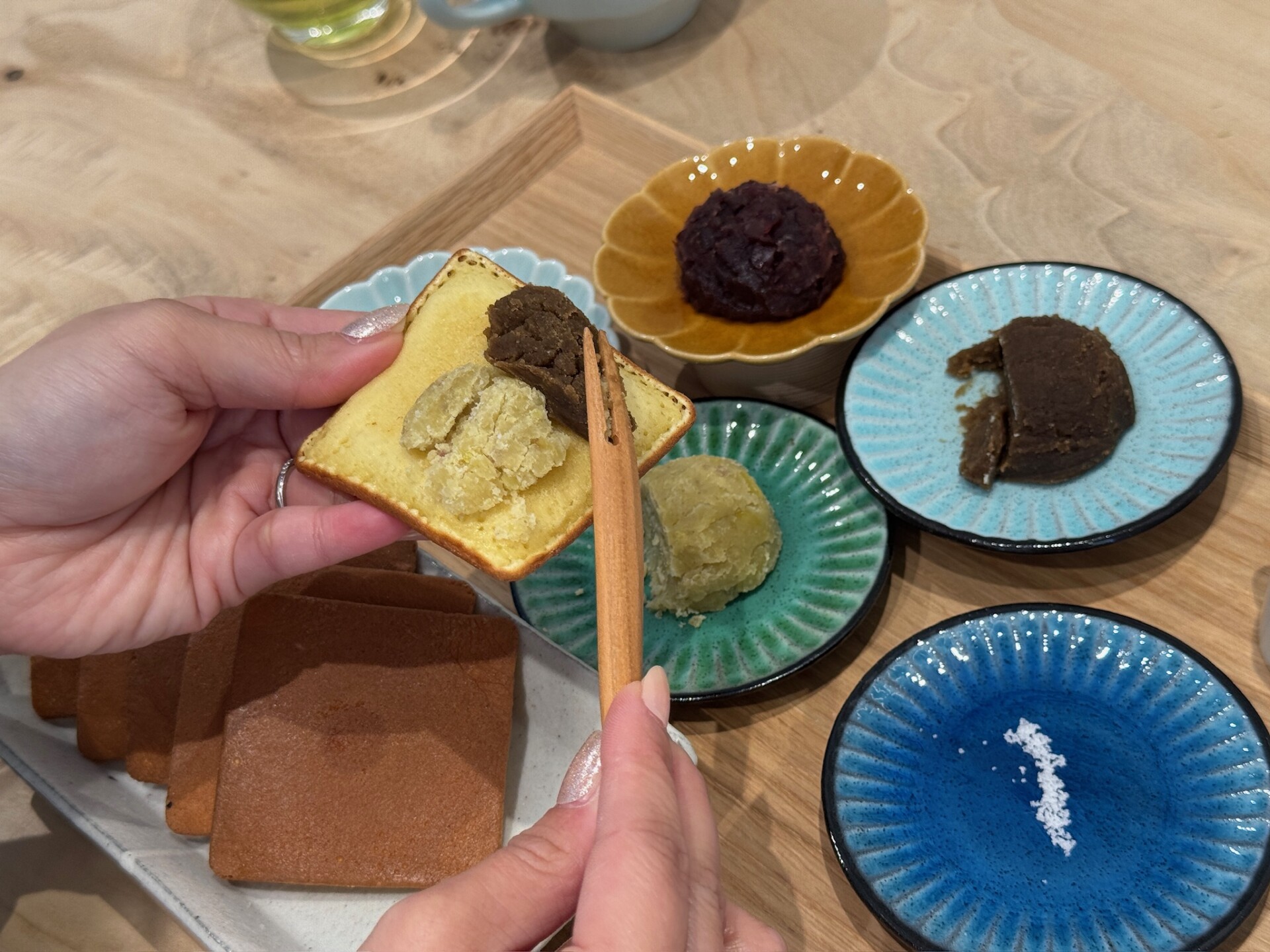 特におすすめの組み合わせは、粒餡と抹茶バター、自家製塩+焦がしバターの組み合わせ。